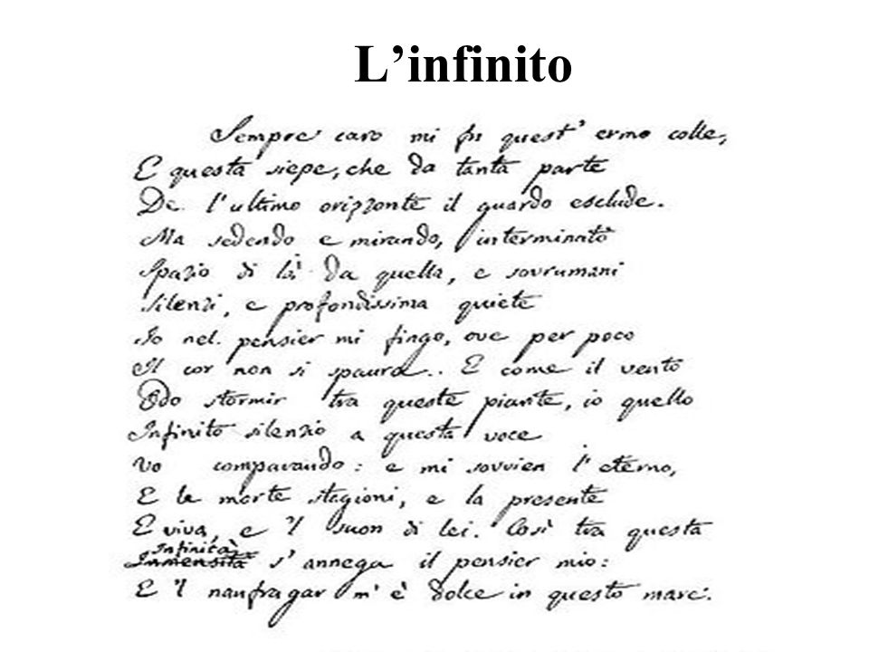 Lo sapeva bene Leopardi, che paradossalmente colloca L’infinito dentro la raccolta dei Piccoli idilli, come se l’immenso potesse essere contenuto nelle cose più piccole. Ma se guardiamo la metrica di quel componimento, ci accorgiamo che c’è una sfasatura, un’eccedenza: la metrica è quella di un sonetto, ma con un verso in più, perché l’infinito, come l’amore, non può essere contenuto dentro la misura di parole umane. Sconfina.